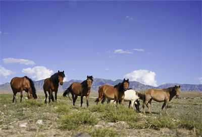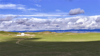 遠(yuǎn)山下的草原,湛藍(lán)天空上的云卷云舒,是牧人和馬兒的天堂。(攝影:達(dá)布西拉圖)