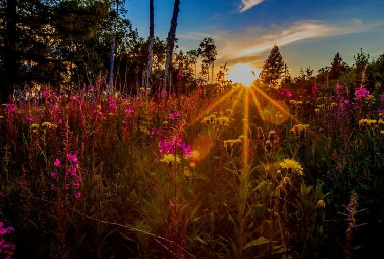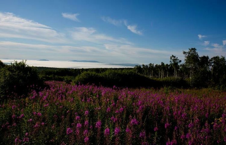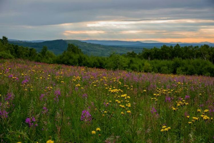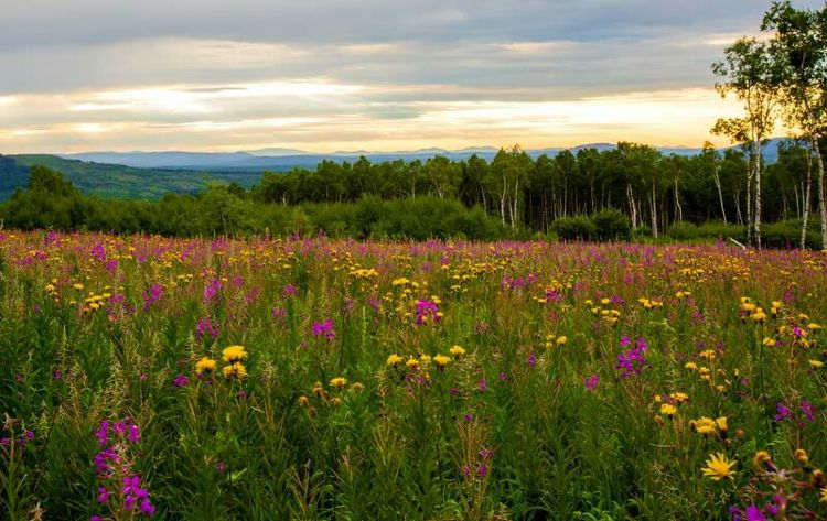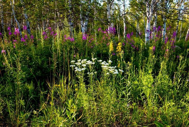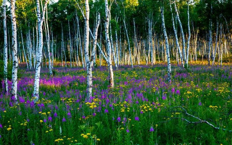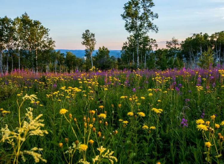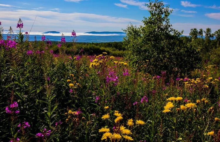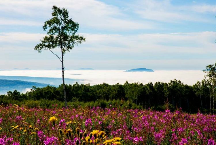 更令人賞心悅目的是,在藍(lán)天白云下,莽莽蒼蒼間,大片的柳蘭花中點(diǎn)綴著黃色的野菊花、紫色的蘭盆花、白色的歐纈草,還有五顏六色的各種野花,繽紛競彩,爭奇斗艷,宛如自然天成的妙筆丹青。