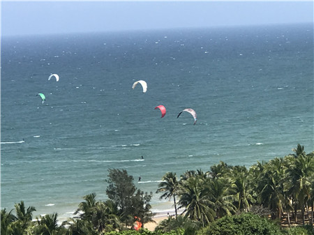 注:海南博鰲長灘雨淋海岸線,三月過后,沖浪者很多,彎彎的彩傘五顏六色,形成海岸一道亮麗的風(fēng)景線,記之!