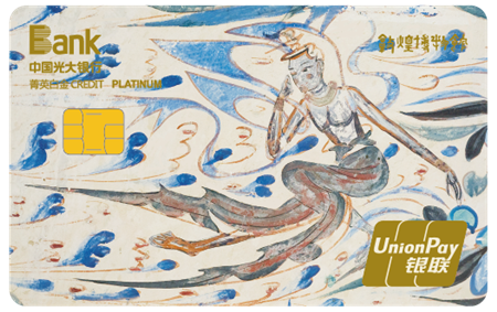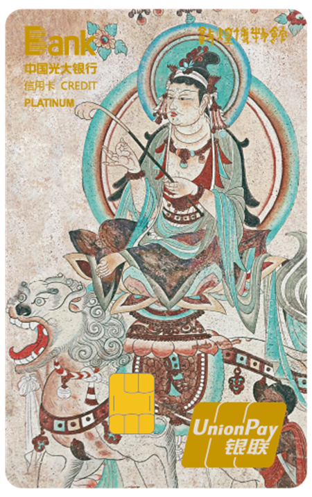 光大敦煌聯(lián)名信用卡卡面設(shè)計取材于敦煌壁畫,有敦煌大智文殊白金卡、敦煌天宮伎樂白金卡以及敦煌五百強盜成佛菁英白金卡三種信用卡。光大敦煌聯(lián)名信用卡的卡面設(shè)計靈感均來源于敦煌壁畫,大智文殊白金卡畫面為文殊菩薩結(jié)跏坐于青面獅虬首仙獅背上。文殊菩薩是專司智德、辯才第一的大菩薩,尊號“大智文殊”。天宮伎樂白金卡主體畫面為伎樂天,取材于莫高窟288窟,營造了佛陀講經(jīng)說法時佛國世界歡樂祥和的氛圍。五百強盜成佛菁英白金卡卡面設(shè)計取自“五百強盜成佛”的壁畫故事,佛用神通使被剜去雙眼的強盜重見光明,并對他們進行點化,五百強盜潛心苦修終成五百羅漢。光大敦煌聯(lián)名信用卡的卡面設(shè)計將傳統(tǒng)文化融入現(xiàn)代金融產(chǎn)品,極具敦煌文化的風格。